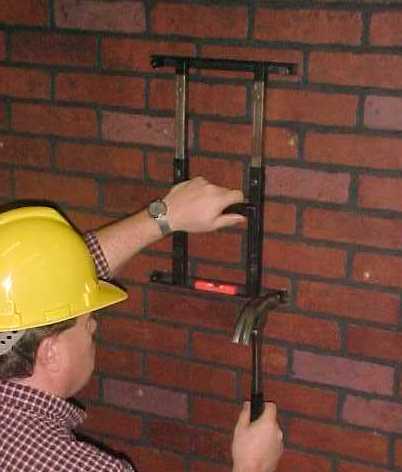 Step 1: Place the template on the wall at the desired position. While observing the built-in level, position the template in a level plane. Strike each of the four corner MARKER PINS with a hammer, thereby identifying the location of each hole to be drilled. |